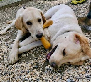 YUM! We fill a Kong with delicious peanut butter and freeze it to create a long-lasting snack your dog will love to enjoy at bedtime or in between playgroups.